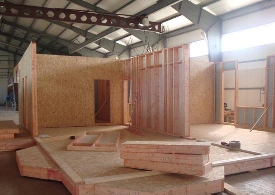 После установки каркаса в нем прокладываются все необходимые коммуникации (центральное кондиционирование, вода, электрика, интернет), затем в каркас укладывается минеральная вата и он закрывается щитами из ОСП.