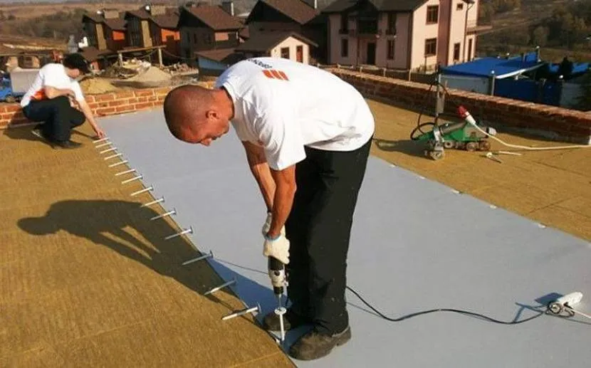 Механическое крепление мембранного полотна рекомендуется применять, если крыша имеет уклон свыше 10–15 градусов. Крепежи должны иметь широкие шляпки и фиксироваться на кровле с разбежкой до 20 см. Но наиболее надежен способ укладки, при котором швы мягкого покрытия свариваются разогретым воздухом температурой в 400–600 С. Однако для него нужен специальный аппарат, это больше вариант для профессиональной команды кровельщиков.