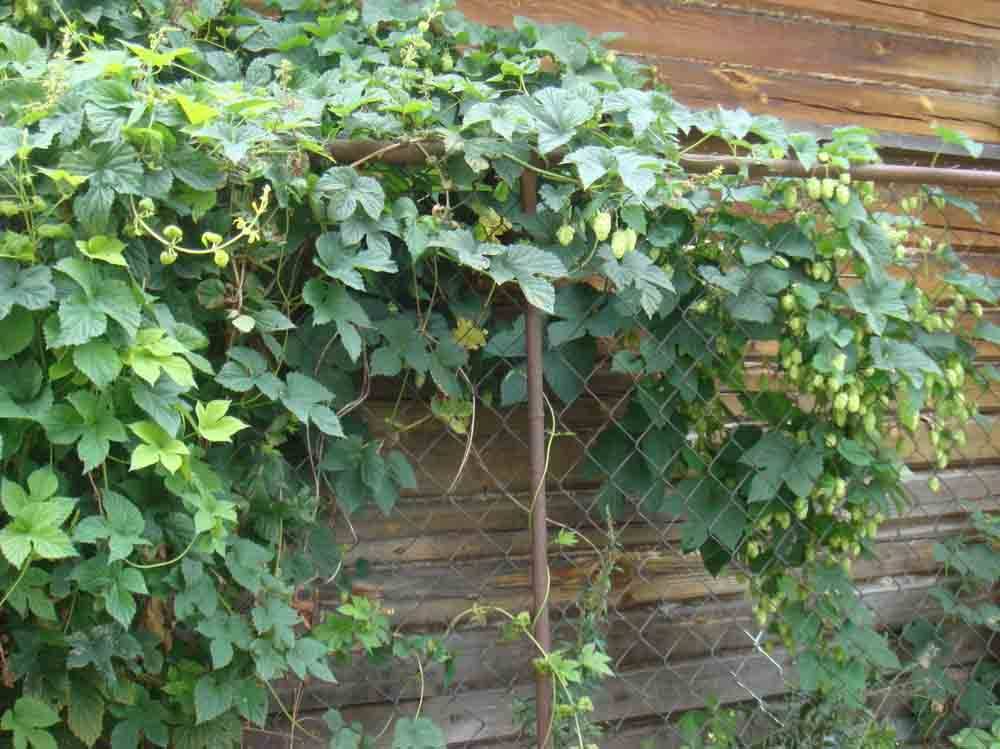 Прекрасно смотрится хмель. Вот только его побеги трудно убирать. Но наиболее лучший вариант – посадить фасоль или горох, которая плотно закроет сетку. Получится не только хорошая «стена», но и урожай.