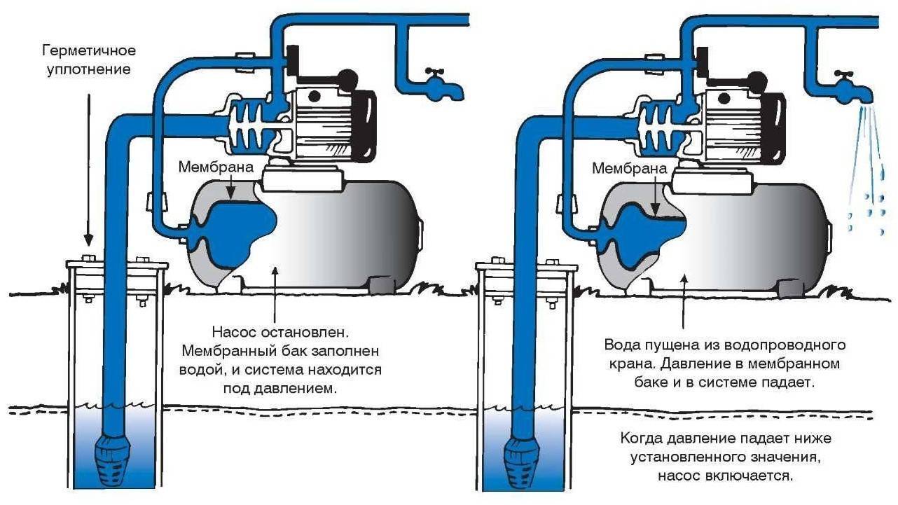 То есть, чем меньше гидроаккумулятор, тем чаще насос вынужден включаться и отключаться, тем чаще давление будет то расти, то падать. Это приводит к ускоренному износу пусковой аппаратуры двигателя – в таком режиме насосы не служат долго. Поэтому, если вы планируете пользоваться водой из скважины постоянно, покупайте для насосной станции бак с большей емкостью.