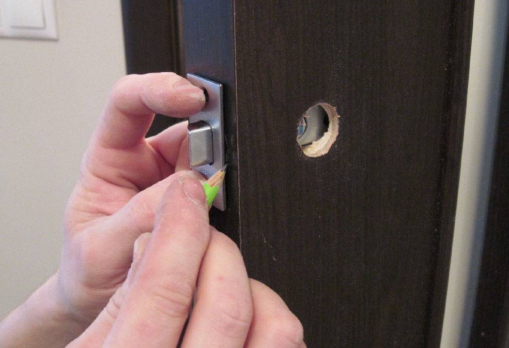 В дверной коробке напротив замка сделать отметку на коробке для защелки. Открыв полотно двери, выполнить разметку, устроить и закрепить луток с пазом.