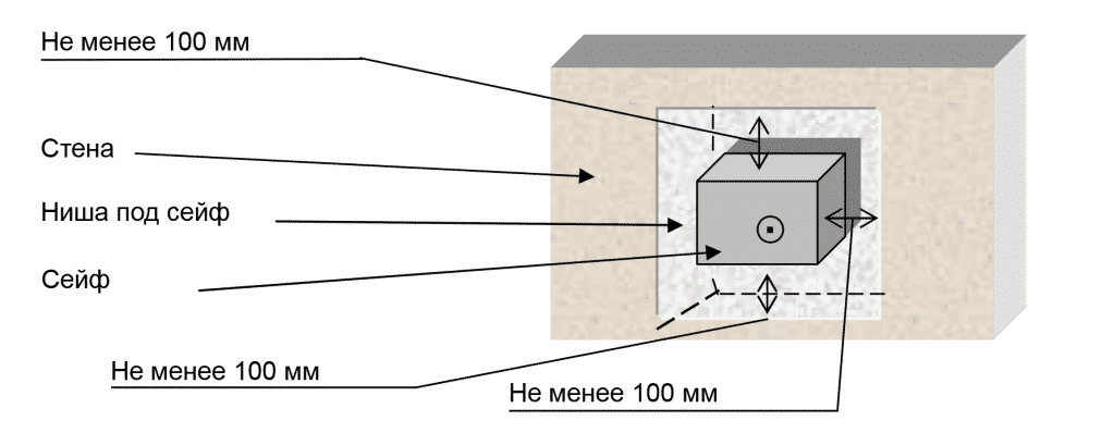При размещении ниши необходимо учесть определенные тонкости. Ее габариты по длине и высоте должны превышать размеры сейфа на 7-8 сантиметров. Сквозное отверстие в стене делать категорически не рекомендуется. Для крепления сейфа при помощи анкерных болтов необходимо наличие части стены не менее 100мм в глубину.