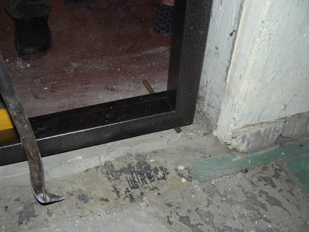 Из дверной коробки выступают по бокам 3-4 пластины. В них есть отверстия для забивания стальных прутьев. Коробку нужно выровнять относительно наружной плоскости стен. С каждой стороны должен быть зазор 1-2 см для выравнивания, которое производится клиньями. Стальные прутья забиваются в отверстия при помощи кувалды, затем кончики прутьев либо привариваются к коробке, либо расклепываются. Вместо стальных прутьев подойдет арматура или анкерные болты. Как правило, такой способ применяется в квартирах.