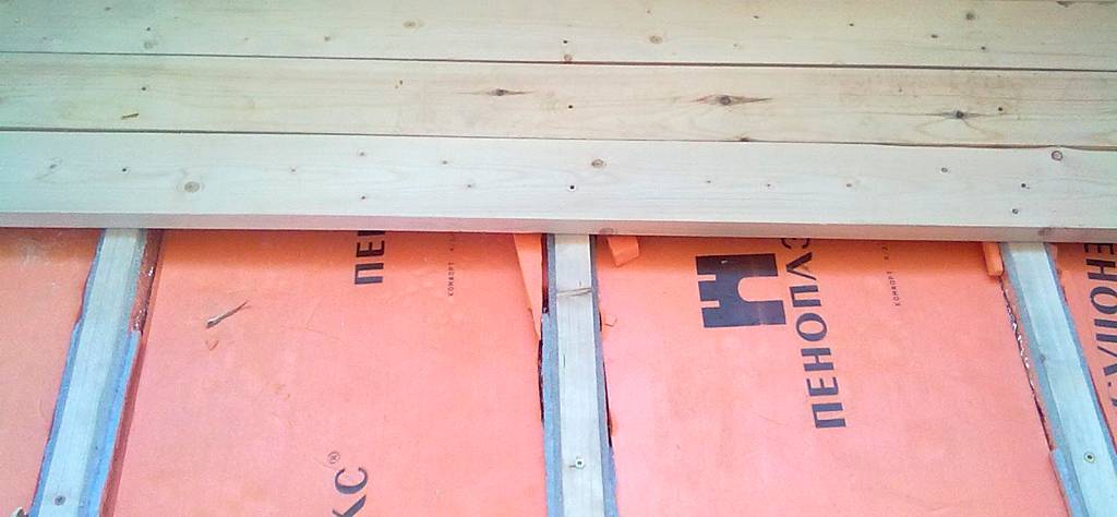 - Ниши между деревянным лагами заполняем теплоизолятором, оставляя вежду верхом бруса и верхней поверхностью изолятора около 2 сантиметров воздушной вентилирующей прослойки. В том случае, если толщина изолятора подходит вплотную к финишному покрытию – положите сверху нее обрешетку для создания вентиляции. Шаг решетки должен составлять около 40 сантиметров.