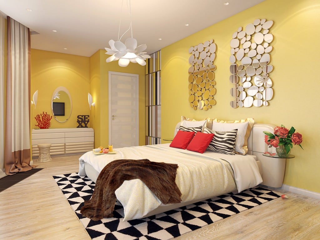 Подсознательно напоминает солнечный свет, вызывает ощущение радости и тепла. В таком интерьере к человеку приходит чувство радости и удовлетворенности своей жизнью. Подходит для дизайна домашних кабинетов. Но этот цвет стен не рекомендуется делать в спальнях людям, имеющим расстройства сна. Для детской комнаты не подходят яркие оттенки желтого, поскольку они вызывают у детей перевозбуждение нервной системы;