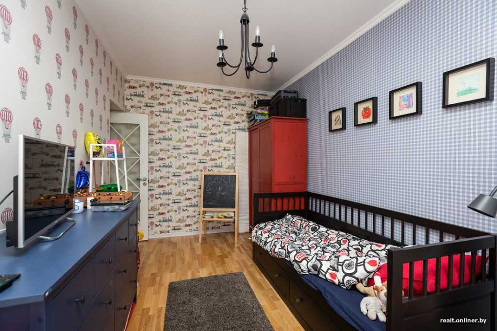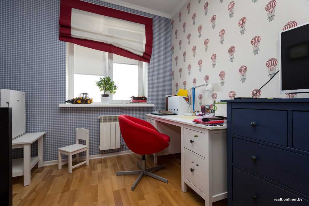 В этой комнате три вида обоев: в голубую клетку, паровозики и воздушные шары.