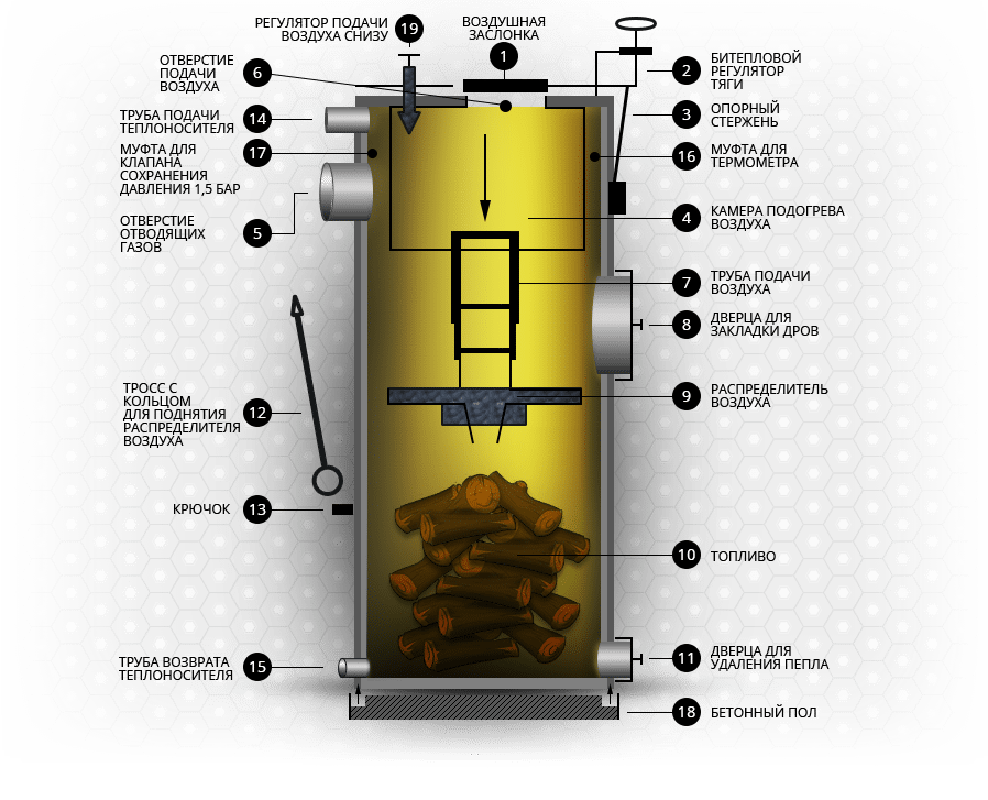 Таким образом, продолжительность горения обеспечивается двухкамерной конструкцией агрегата, когда топливо медленно горит в топке, а образовавшиеся горючие газы сжигаются во второй камере.