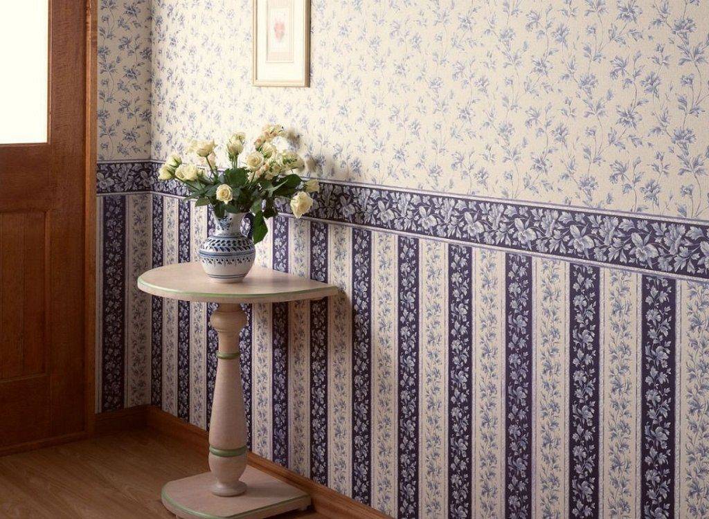 Воссоздание такой отделки начинается с выбора материала. Для низа, который будет занимать одну треть стены, необходимы образцы с активным принтом. Наверх клеятся однотонные светлые рулоны или с горизонтальными линиями, которые будут сильнее удлинять стену.