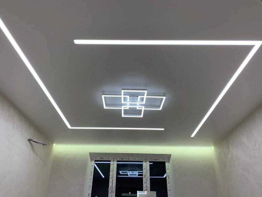 Подсветку можно использовать на разноуровневых и натяжных конструкциях. Дизайнеры рекомендуют устанавливать LED-светильники по периметру комнаты и выделять отдельные элементы потолка. На разных уровнях конструкции светодиодная полоса устанавливается на перепадах высот. В натяжном потолке – это могут быть прямые или хаотичные линии на поверхности или выделение зоны люстры. В это случае применяются специальные световые полосы, куда приклеивается светодиодная лента.