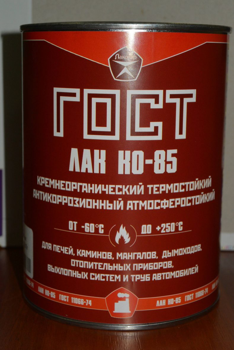 КО-85, пожалуй, самый популярный на российском рынке термоустойчивый лак на основе органического кремния. Используется для лакировки кирпичных, каменных, металлических покрытий. Лак отличается хорошими адгезивными свойствами по отношению к обрабатываемым поверхностям, а также отличными антикоррозийными свойствами. КО-85 делает поверхность более свежей сам по себе, но может использоваться также совместно с эмалью. Термическая устойчивость лака находится в диапазоне от минус 40 до плюс 300 градусов.