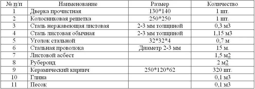 Таблица необходимых материалов для постройки камина