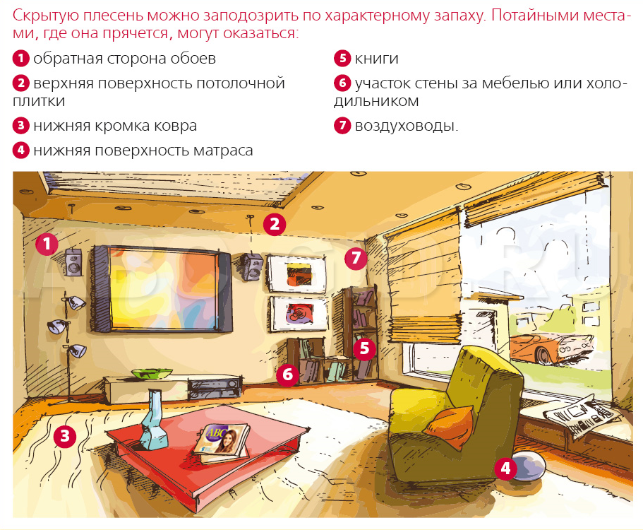 В условиях сырости, низкой температуры, неполноценного доступа воздуха начинают развиваться грибки, появляется темный налет, желтые и зеленоватые пятна на разных поверхностях помещения. Часто они возникают на плохо проветриваемых участках, куда очень тяжело добраться, чтобы выполнить уборку или проветривание.