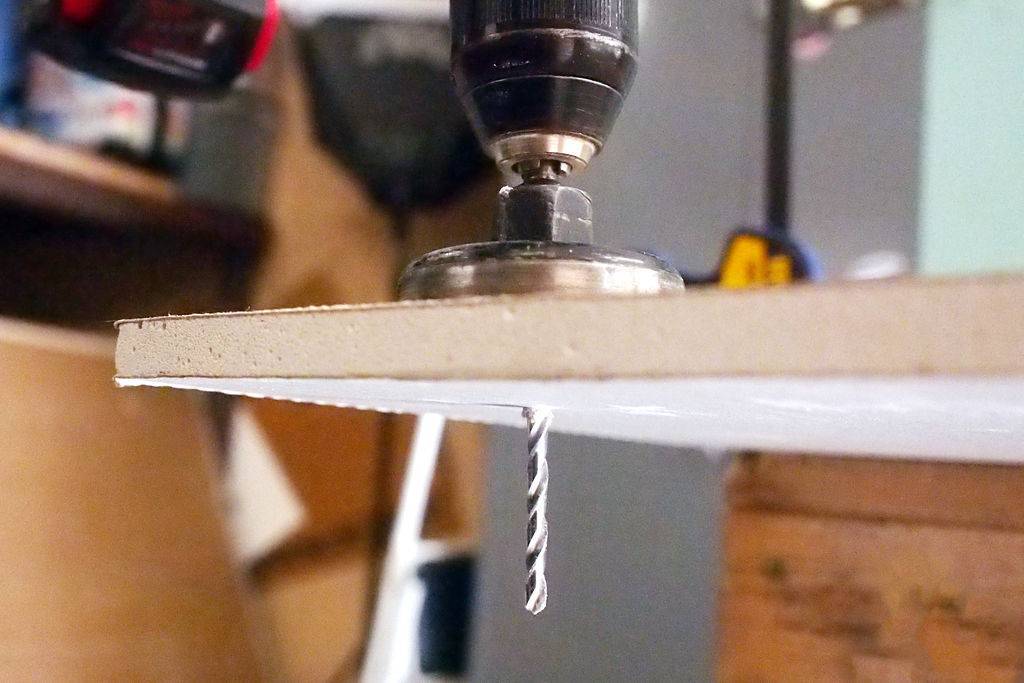 Держа дрель строго перпендикулярно поверхности, начните резать гипсокартон. Не прорезайте его насквозь!