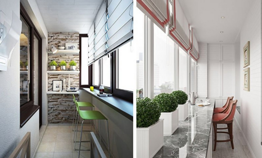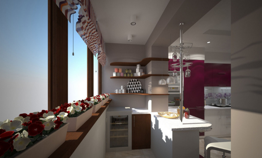 Так, вместо подоконника советуют установить широкую и длинную столешницу, рядом поставить стульями. Ремонт на лоджии мастера советуют выполнять в едином дизайне с кухней.