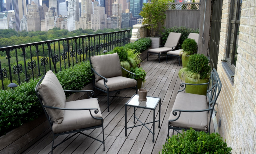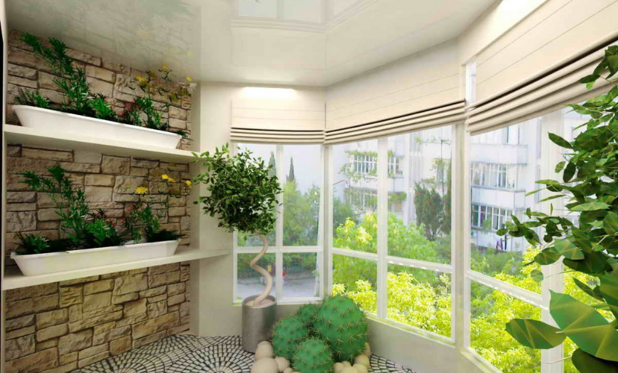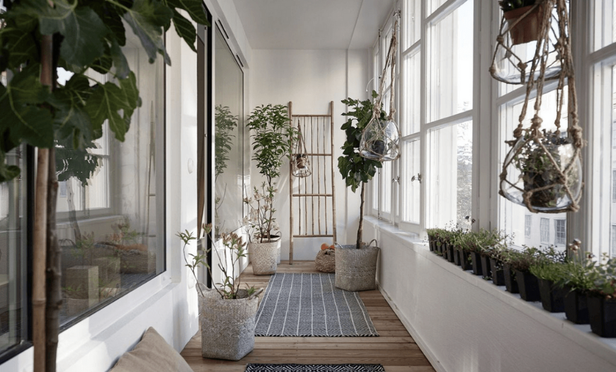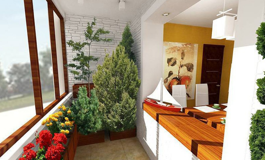 Оригиналный способ облагораживания балкона – устройство на его площади теплицы или оранжереи. Если помещение отапливаемое, то зеленый уголок будет красиво смотреться с улицы зимой. В качестве пола можно использовать террасную доску либо плитку.