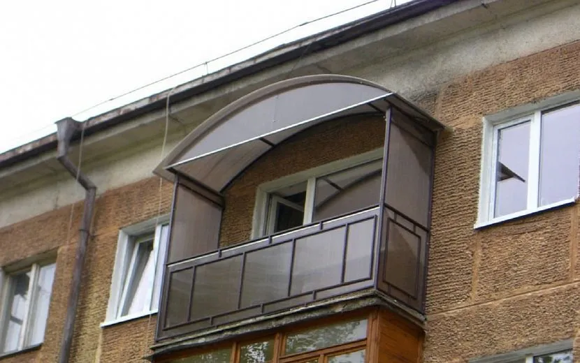 Купольный козырек имеет полусферическую обтекаемую форму. Его края могут выходить далеко за пределы балкона, надежно защищая его от дождя. Чаще всего изготавливается из цветного или прозрачного сотового и монолитного поликарбоната.