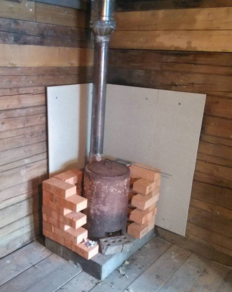 На металлический лист укладывают кирпичный фундамент в один или два ряда, в зависимости от крепости полов. На него и устанавливают печь. После возведения фундамента нужно выждать пару часов, чтобы схватился раствор.