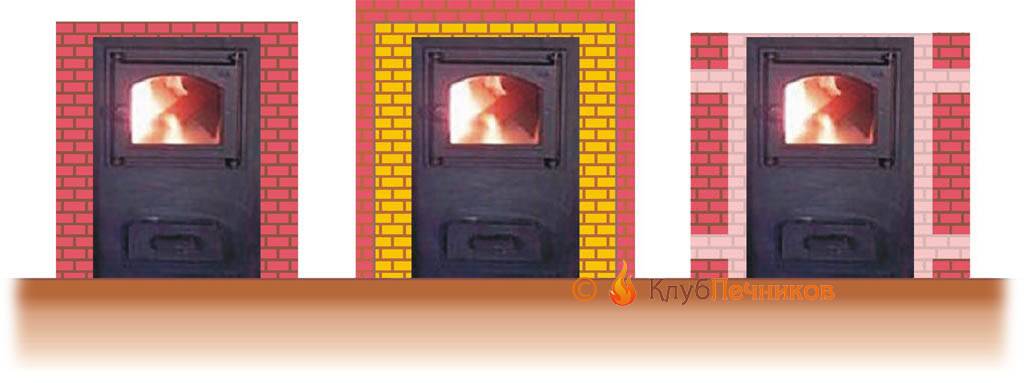 С точки зрения теплотехники обложить металлическую печь кирпичом возможно 3-мя способами. Сплошная облицовка печным или красным рабочим кирпичом (слева на рис. ниже) применяется, как уже сказано, если от печки требуется только зрелище пляшущих за стеклом топки языков пламени или печь используется преимущественно как водогрейный котел. В первом случае облицовку делают толстую, не менее чем в кирпич. Действие ее таково: