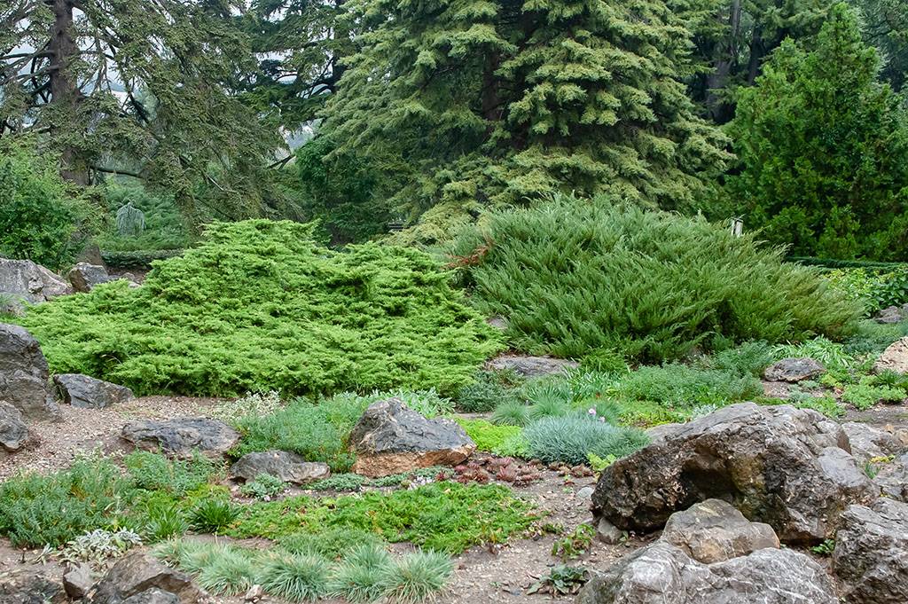 Живописный сад с камнями станет привлекательнее, если на него высадить хвойные растения. Формируют подобные цветники на ровной местности либо умеренных склонах. При этом нужно придерживаться плавных форм, избегая излишней симметричности деталей. На фоне часто высаживают почвопокровные сорта растений, включая хвойные подвиды.