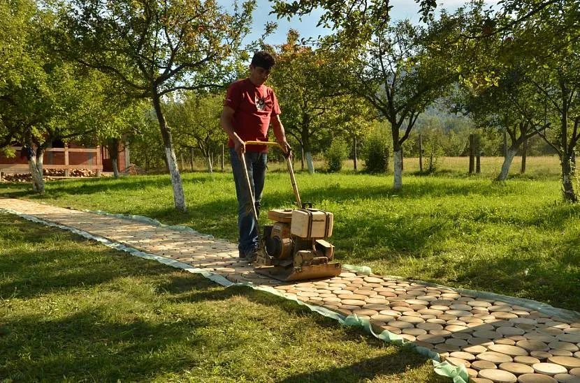 Дорожку из спилов дерева своими руками сделать несложно. Срезы укладываются в выемку на заранее уплотнённую подушку. Монтаж чурбаков необходимо проводить, чтобы между плашками оставались минимальные швы. Образованные зазоры заполняются гранотсевом и песком в несколько приёмов. Смесь высыпают на покрытие и сметают веником до полного заполнения швов. Изделия из дерева можно совмещать с тротуарной плиткой или бетоном.