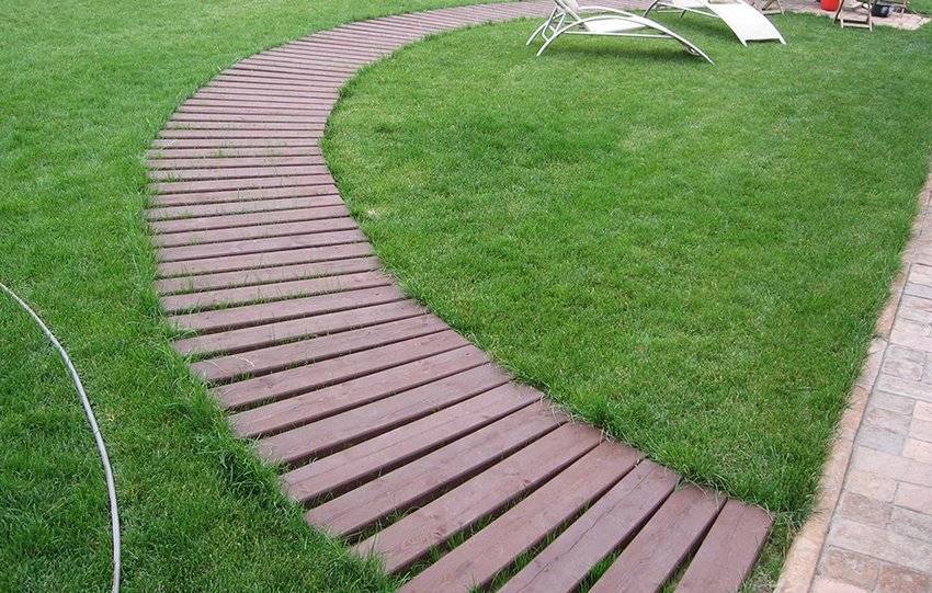 Как понятно из названия, такие тропинки делаются из досок, которые можно заказать или использовать имеющиеся отходы после строительства. Для придания нужной формы пиломатериалу, его обрабатывают со всех сторон на станке или вручную с помощью электрорубанка.