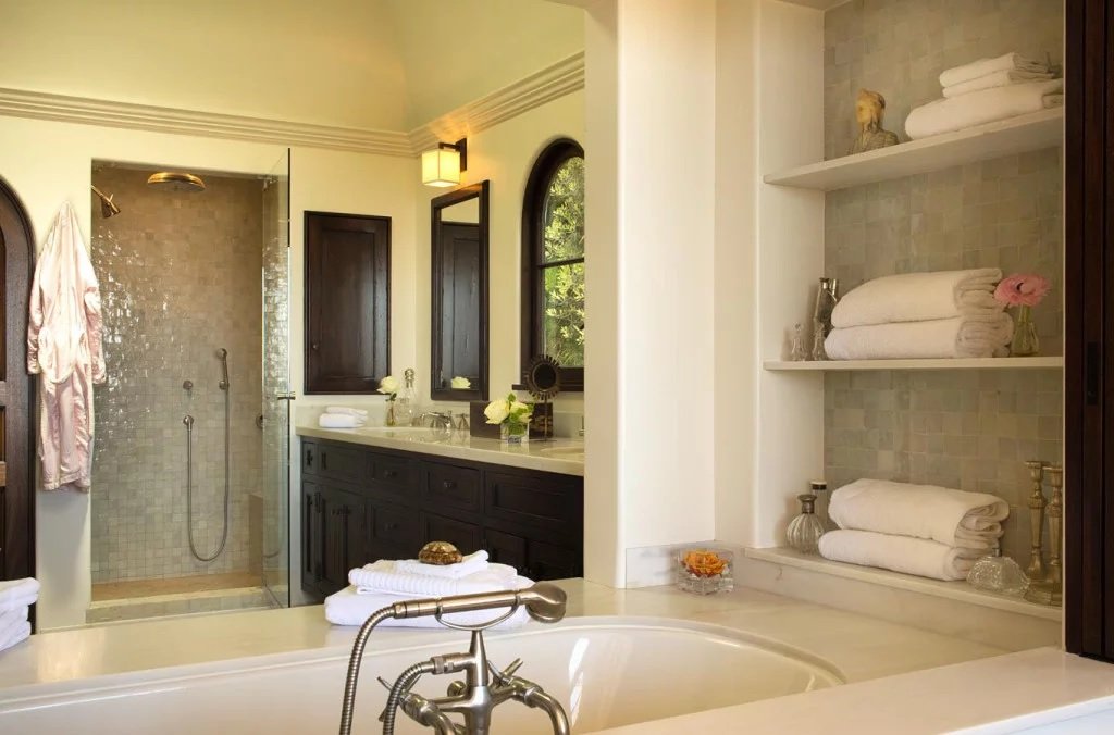Ванная комната в колониальном стиле декорируется кафельной плиткой. Если речь идет об английском направлении, то органично будет смотреться «шахматка» из кафеля терракотового цвета и оттенка мокрого асфальта на стенах. Пол отделывают светлой керамической плиткой, уложенной елочкой с прикрепом. Мебель для ванной выбирают из дерева (специально обработанного) светло-коричневых оттенков. Стену над раковиной украшают прямоугольным зеркалом в простой оправе. По обе его стороны размещают простые светильники. Традиционная ванна декорируется латунью и стоит на изящных ножках, как во всех классических интерьерах. На столешницу возле раковины ставят глиняные сосуды, посуду, миниатюрных слонов, инкрустированных камнями.
