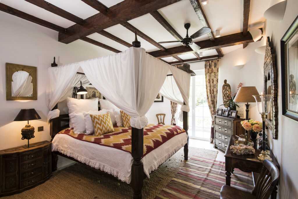 Кровать имеет деревянные или кованые спинки, а также полог, который может выглядеть как шатёр в духе восточных сказок Шахерезады. Или это могут быть деревянные стойки с натянутыми по периметру занавесями – как в домах зажиточных индийцев.