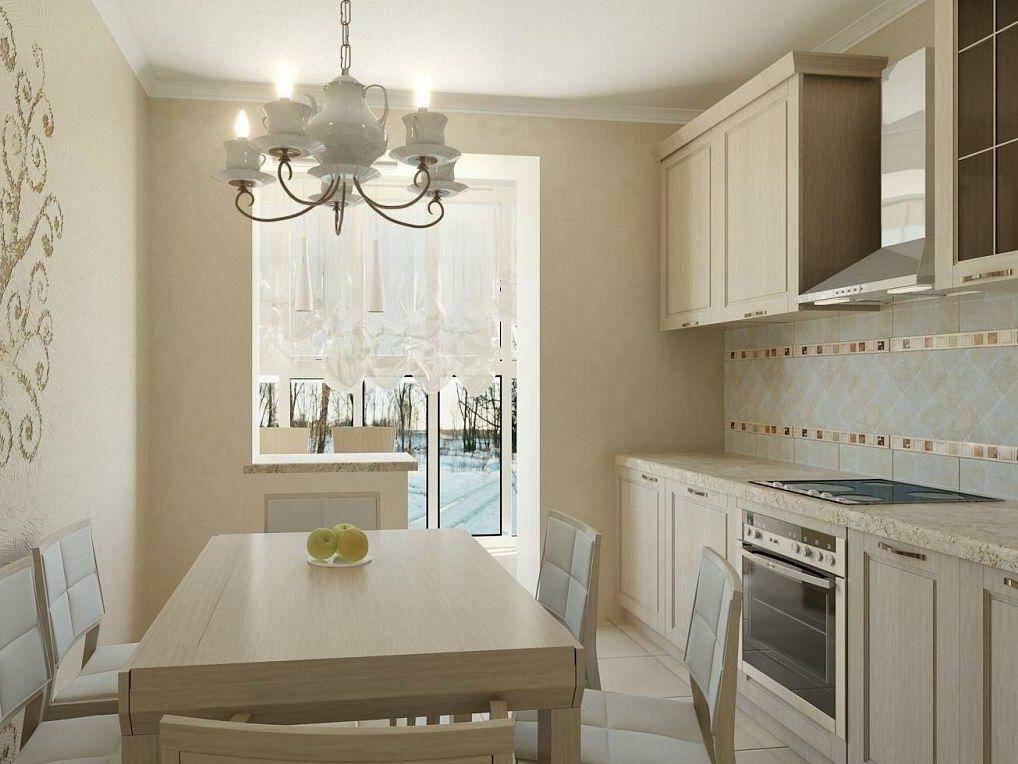 Если кухонный гарнитур выполнен в бежевом цвете, то более приемлем будет натуральный цвет обоев, в том числе имитирующий древесину. Обои тон в тон подойдут в данном случае только если будут иметь интересную текстуру или принт. В качестве ярких цветовых решений к бежевой мебели можно выбрать голубые либо лавандовые обои и их оттенки.