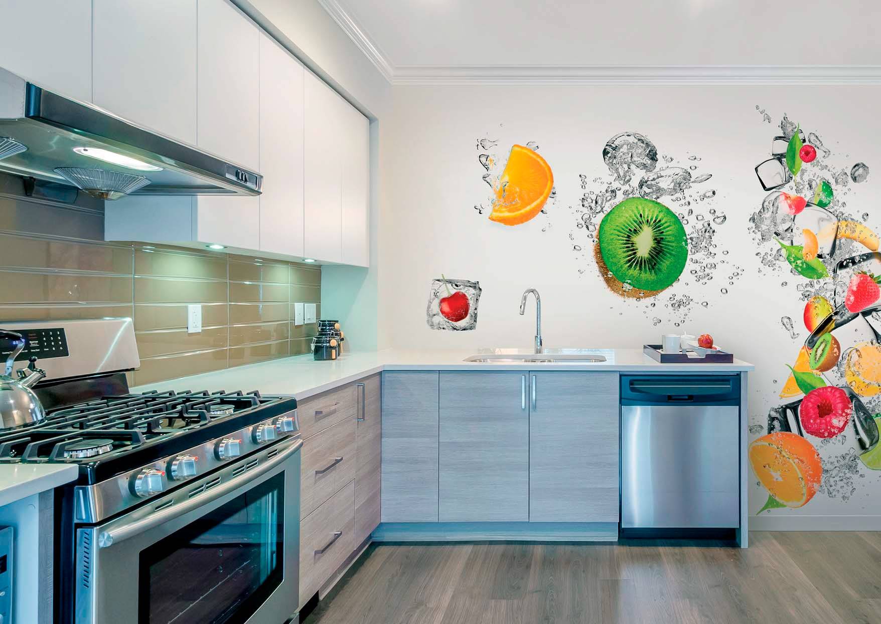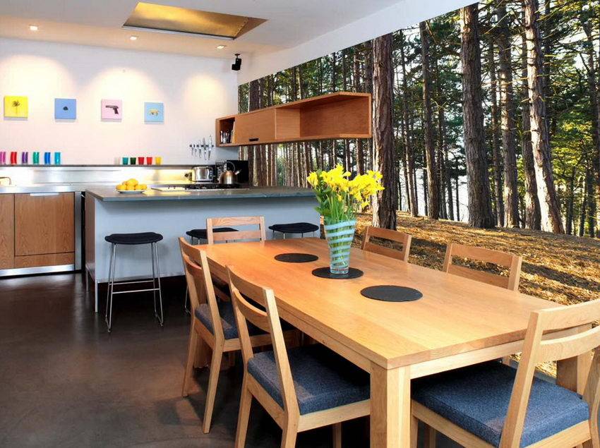 На просторной кухне прекрасно смотрятся фотообои с пейзажами или кухонными натюрмортами
