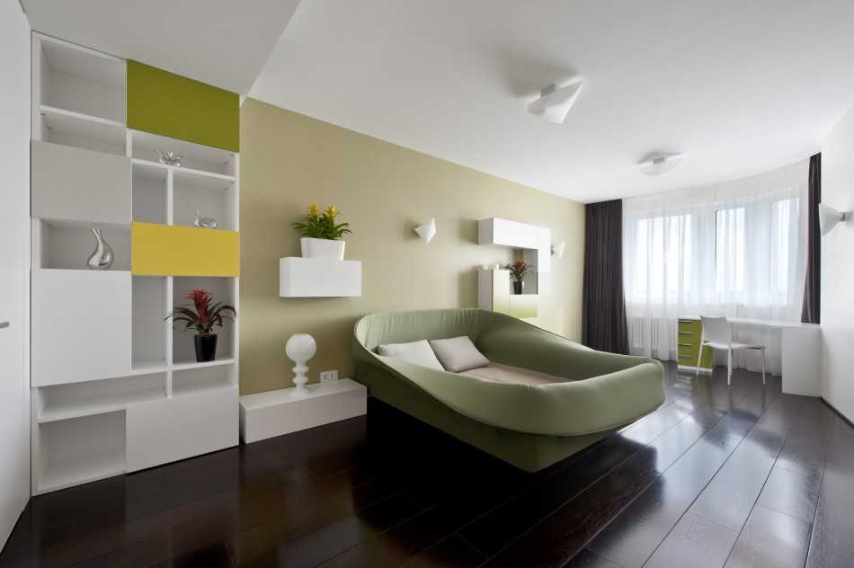 Для зонирования, можно использовать и разно уровневые полы и потолки. Уместно смотрятся подиумы, на которых оборудуется спальное место или «кабинет».