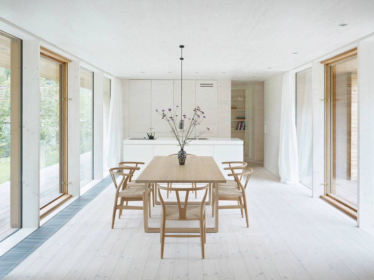 Интерьер дома в русле минимализма, от прихожей до спальни, включая общие зоны, должен быть решен не более чем в трех цветах на комнату.