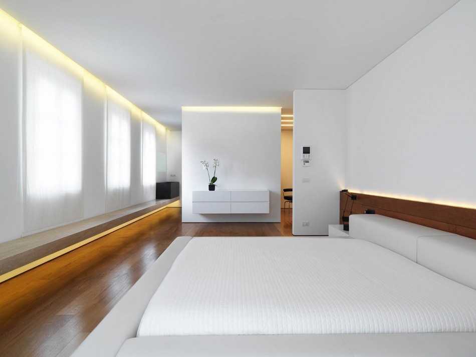 Для достижения максимального эффекта стены и потолки окрашивают в белый цвет, заставляя свет отражаться от поверхностей и делать комнату ещё светлее и больше. Лучше всего если освещение в стиле минимализм будет незаметным.