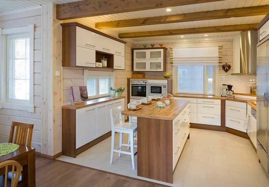 Значительная площадь помещения в большинстве случаев предполагает присутствие островной конструкции, присутствие которой может быть акцентировано, например, контрастным оттенком.