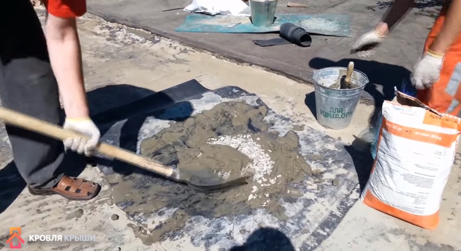 Работать дешевле цементно-песчаным раствором. Готовьте его прямо на крыше гаража в пропорции 1:4. На часть цемента четыре части песка, вода по необходимости.