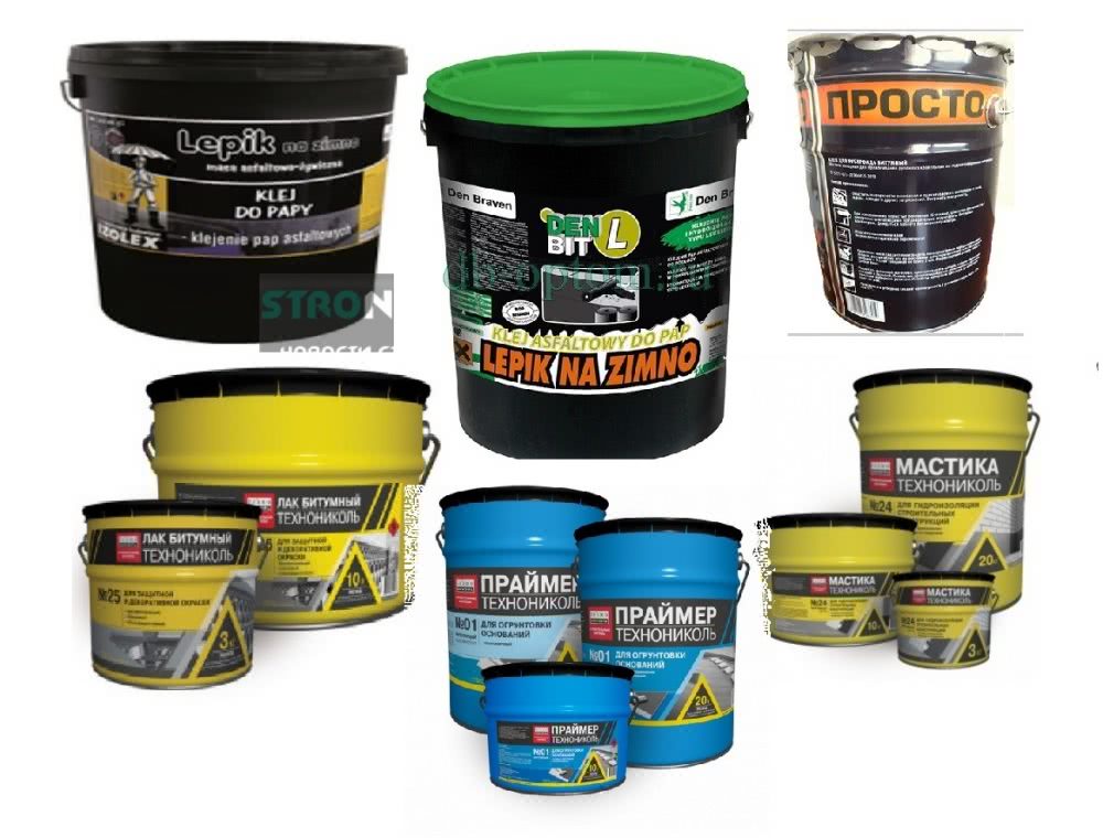 Битумная мастика – жидкая смесь из нескольких компонентов, которая включает битум и растворитель, разнообразные технические добавки и наполнители. Производители предлагают два вида клея: для горячего и холодного метода укладки. Первый тип мастик допускает незначительный разогрев клеящей смеси в процессе наклейки. Вторая разновидность клея для еврорубероида нуждается в обязательном подогреве до определенной температуры для максимальной адгезии. Мастики для укладки гидроизоляции горячим методом необходимо прогреть до 200°С. Они пригодны для склеивания мягкой кровли, гидроизоляции стен, перекрытий и прочих конструктивных элементов строений.