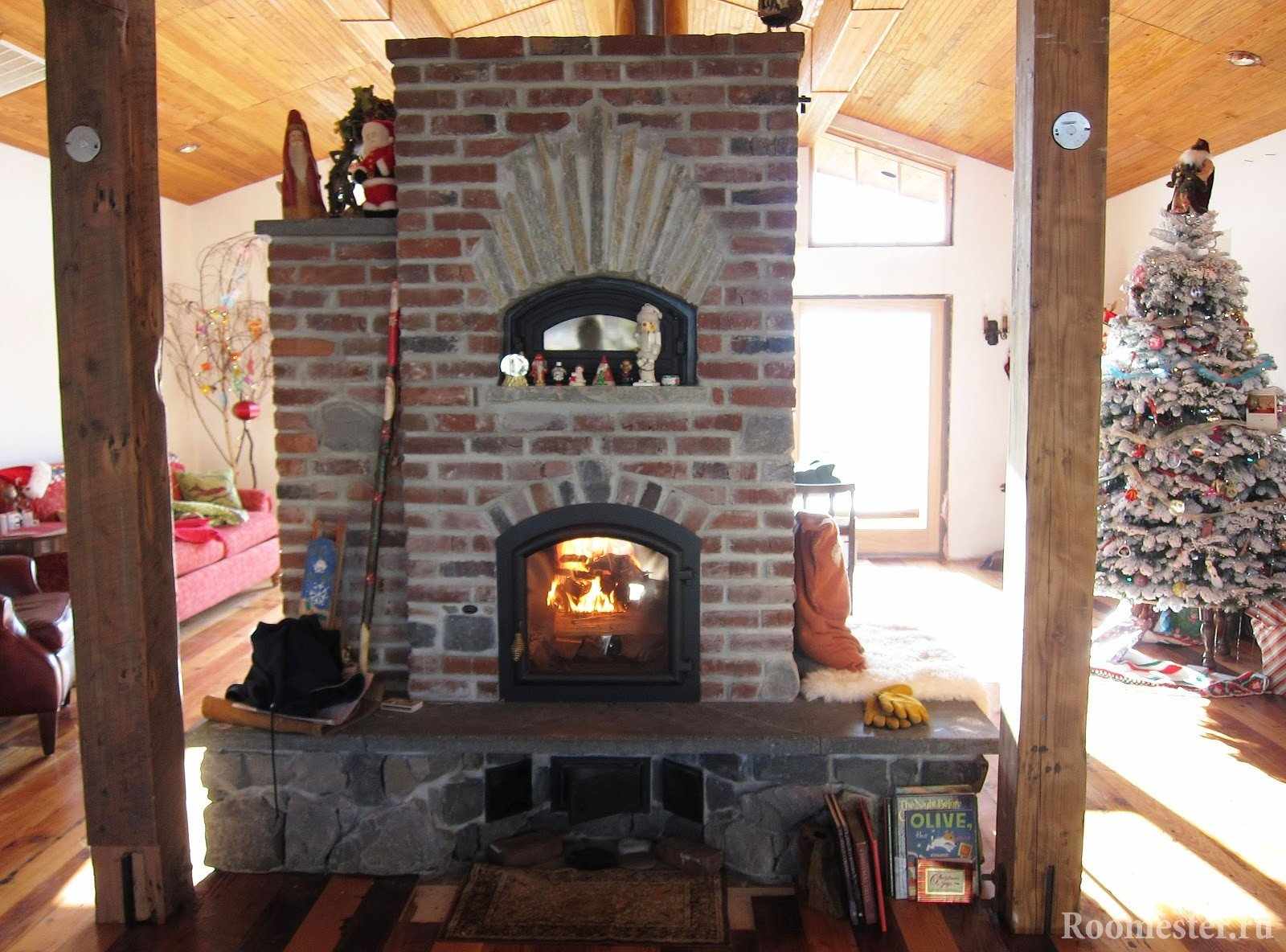 Это уникальное устройство, которое сочетает в себе свойства камина и русской печи. Ее корпус производится из чугунных и стальных листов, а топка выкладывается из огнеупорного кирпича. Дверца изготавливается из термостойкого стекла. Для отопления в данном случае можно использовать дрова, природный газ и уголь.