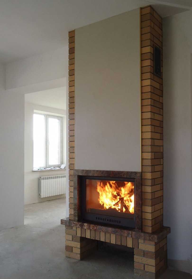 Отличное место для камина — стена между окнами в просторной гостиной частного дома. Вариант с дымоходом в большом помещении смотрится эффектно.