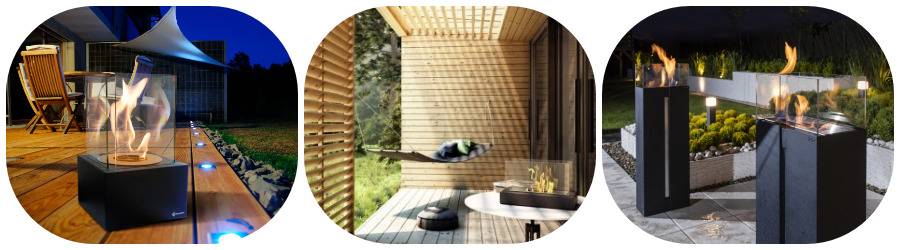 Существуют биокамины специально для работы снаружи дома, например, на балконе или террасе. В них горелка полностью прикрыта стеклянными панелями, чтобы ветер не задувал огонь. Также для улицы могут использоваться электроочаги с инфракрасной панелью. Такие можно применять даже в холодное время года для комфортного пребывания на улице, т.к. они будут нагревать предметы, на которые направлены, а также самих людей.