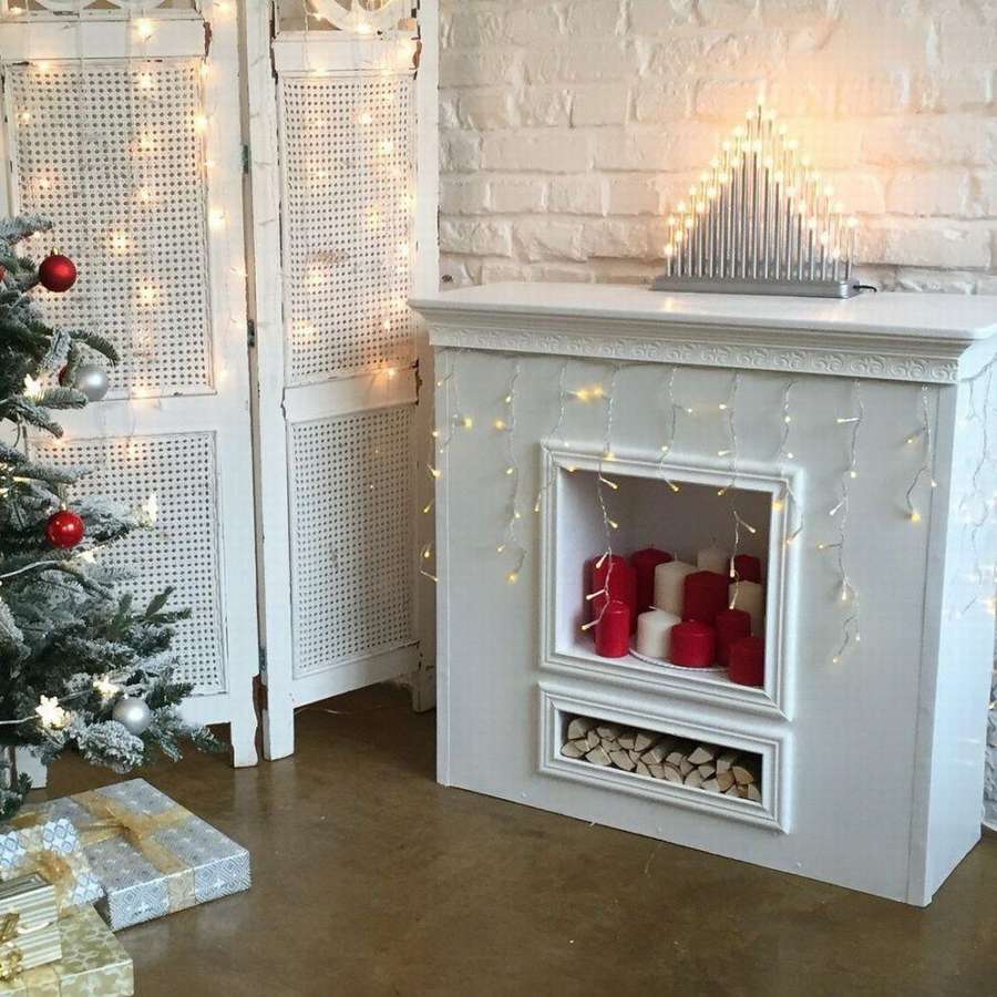 На завершающей стадии проводится декорирование, используется имитация кирпичей, пенополиуретановый молдинг и пластиковый уголок. На внешнюю сторону камина можно наклеить пенопласт в виде кирпичей или купить пластиковую имитацию кирпичной кладки и также наклеить. Подобная имитация камина, сделанная на Новый Год, позволит вам создать неповторимую атмосферу зимнего праздника.