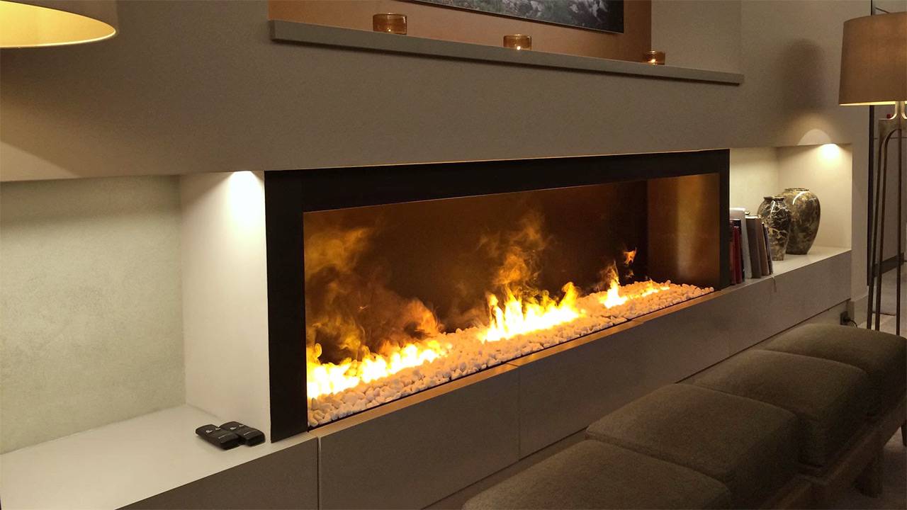 Фишка панорамных электрокаминов в размере. Они протягиваются на 2-4 метра вдоль стены. Эффект пламени очень глубокий, практически не отличим от натурального.