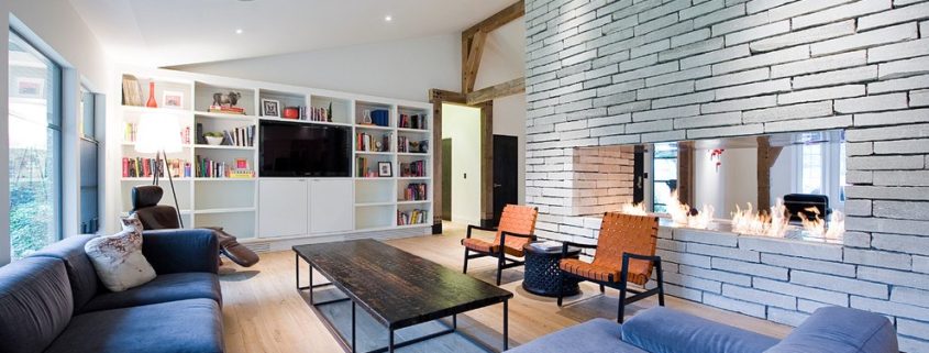 Современный камин в интерьере выполняется из различных материалов, главными требованиями к которым выступают: надежность и прочность.
