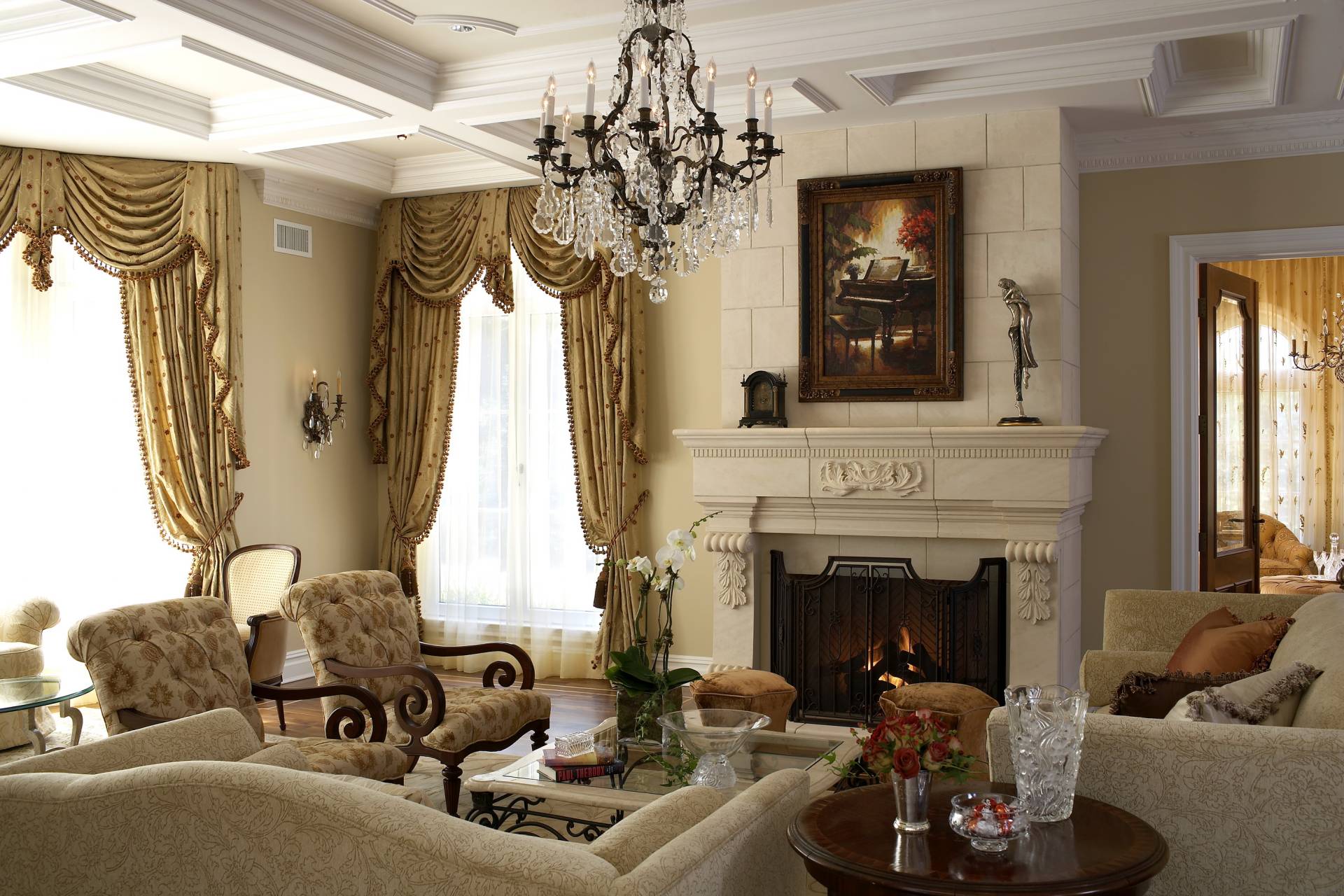 Изящество и воздушность, максимальное стремление к личному комфорту хронологически следующего стиля рококо не могло не сказаться на облике архитектурной доминанты интерьера. Дизайн классического камина получил вычурные элементы, затейливые орнаменты, завитки, гирлянды и отделку в виде необработанного камня, резного дерева, позолоты. Применение мрамора усиливало визуальный эффект. Замаскированный таким образом очаг, обрамленный в пастельные тона с установленными на полках изысканными миниатюрными статуэтками, канделябрами, наполнял интерьер легкостью и помпезностью. Окружающее пространство визуально расширяется. Камин в классическом стиле в интерьере гостиной располагал к приятному отдыху: созерцанию открытого пламени, музицированию, пению, чтению и общению с домочадцами.