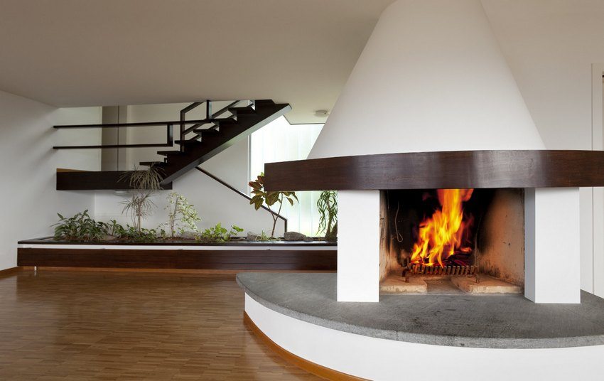 Островные кирпичные камины в интерьере занимают центральное место, поскольку они устанавливаются посередине помещения. За счет этого тепло равномерно распределяется по дому, что, несомненно, является преимуществом подобных конструкций.