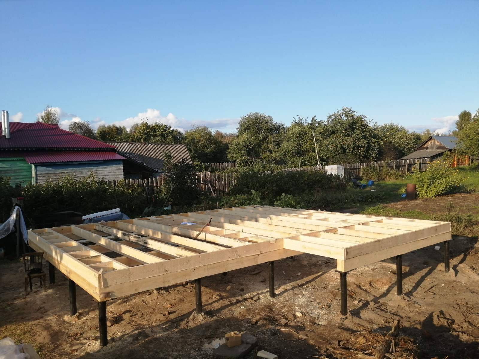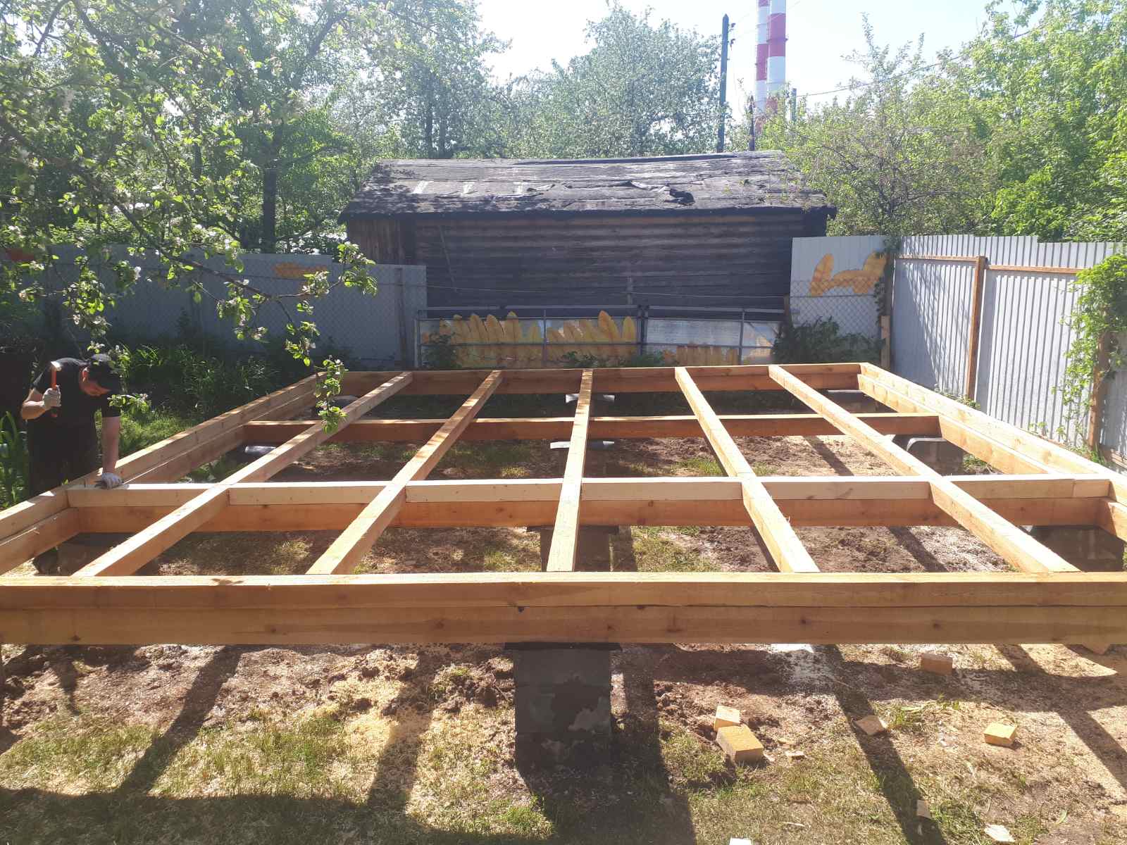 По периметру установленного фундамента монтируются лежни, которые крепятся к фундаменту специальными анкерами. Перед закреплением лежней надо проверить все размеры и соответствия диагоналей. Дальше на торец ставится обвязочная доска к которой крепятся лаги из досок поставленных на ребро.