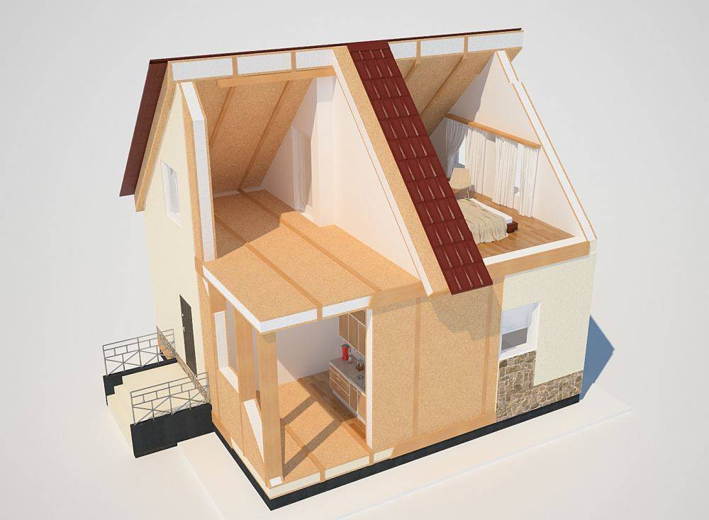Каркасные дома сип собраны из панелей, сделанных по принципу сэндвича: блок полистирола, вклеенный между листами ОСП с помощью полиуретанового клея. Применение ориентированно-стружечных плит значительно ускоряет строительство, так как уже объединены три слоя и остается только обшить их отделочными материалами снаружи и внутри. Утеплитель не нужно монтировать отдельно и дом строится быстрее, чем классический каркасник.