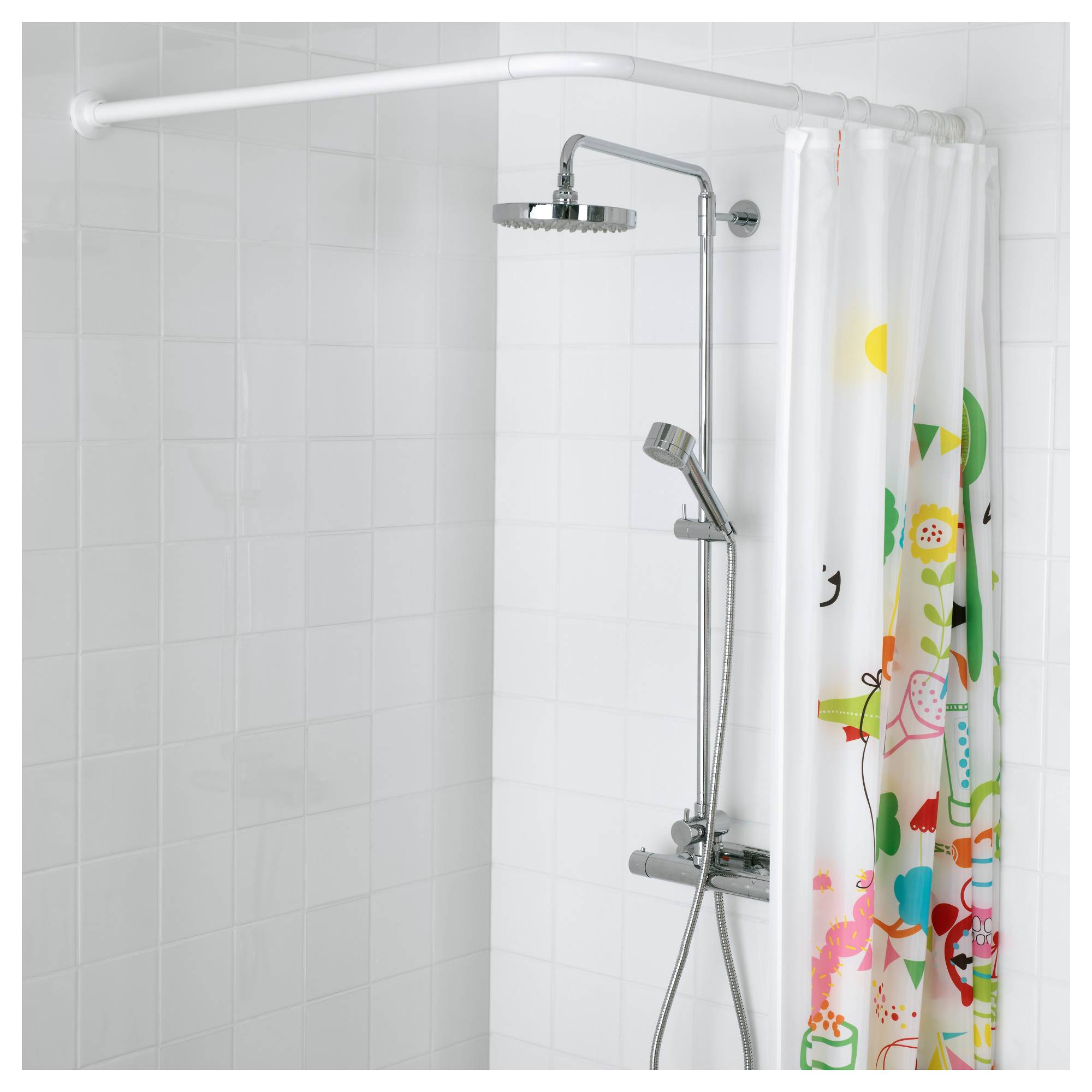 Достаточно востребованными во многих интерьерах санузлов являются угловые перекладины. Угловой карниз крепится не к противоположным, а к смыкающимся стенам, тем самым отгораживая небольшую зону для купания и принятия душа. Крепление на саморезах или анкерных болтах здесь должно быть достаточно прочным, так как выступающий угол будет создавать дополнительную нагрузку в качестве своеобразного рычага. Иногда, чтобы уменьшить такую нагрузку, даже используют дополнительный подвес от выступающего угла к потолку.
