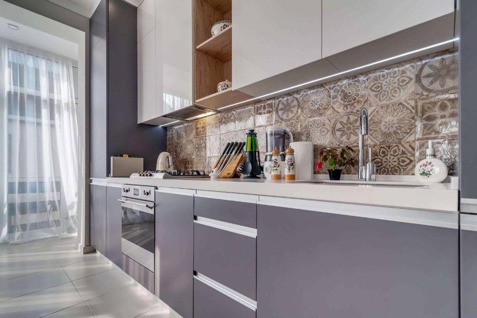 Рисунок плитки на фартуке может кардинально отличаться от общего минималистского стиля кухни: