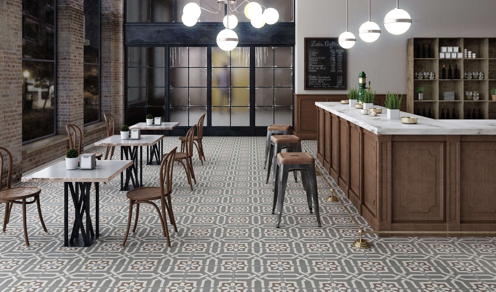 В современных кухнях, кафе и ресторанах, полы покрывают керамической плиткой.