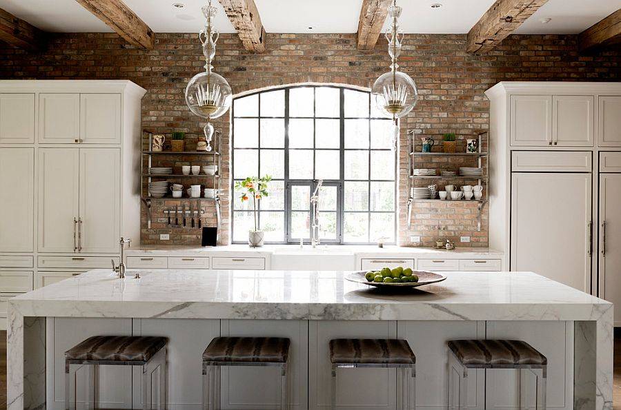 Светлый отделочный материал не будет перегружать оформление, как это может быть в случае с используемыми в избытке красными аналогами. Кухня из кирпича и дерева, выдержанная в светлых тонах, является интерьерной классикой, которая не только вписывается в уже упомянутые стили, но также может быть хорошим рецептом для деревенской или современной комнаты.