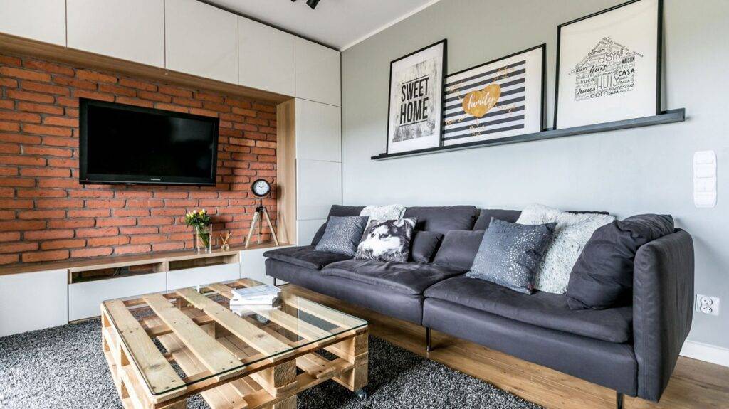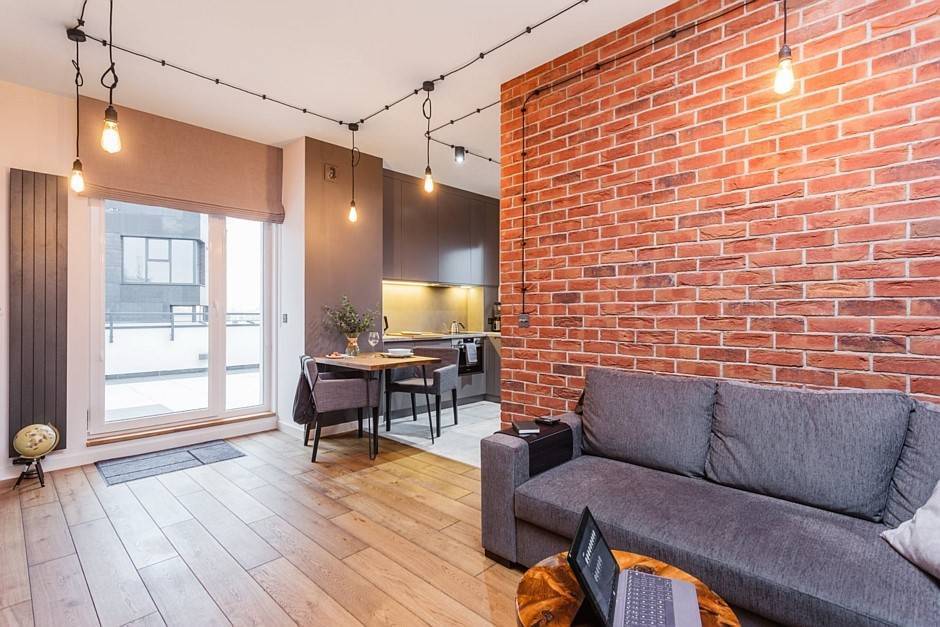 Это особое помещение в квартире, требующее тщательно подхода к оформлению – ведь именно здесь будут проводиться праздничные мероприятия в кругу друзей и близких, семейные посиделки. В новомодных интерьерах нередко можно встретить оформление гостиных с акцентом на кирпичных стенах. Стоит отметить, что кладка сама по себе является прекрасным декоративным элементом, не требующим дополнительных украшений. При желании на кирпичной стене можно оформить галерею семейных фотографий, демонстрацию художественных произведений или постеров.